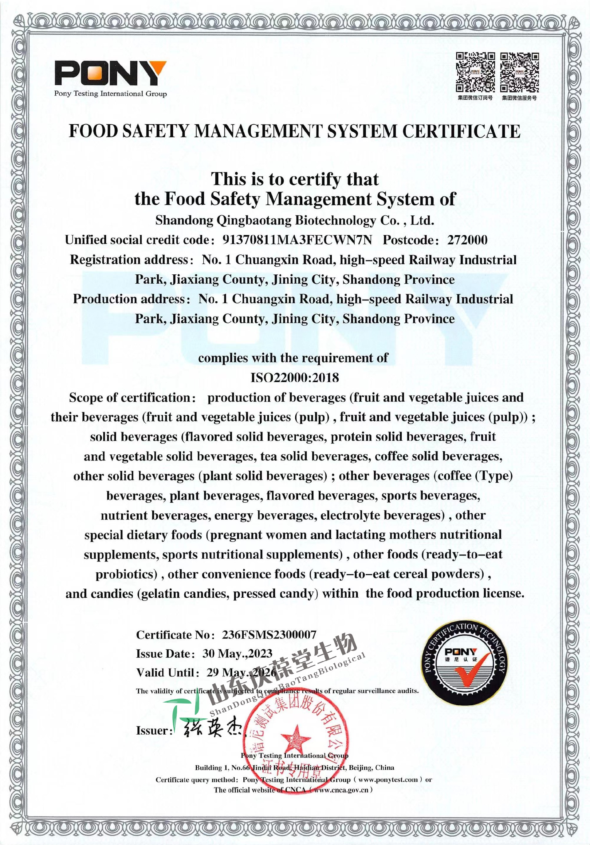 食品安全管理体系认证证书